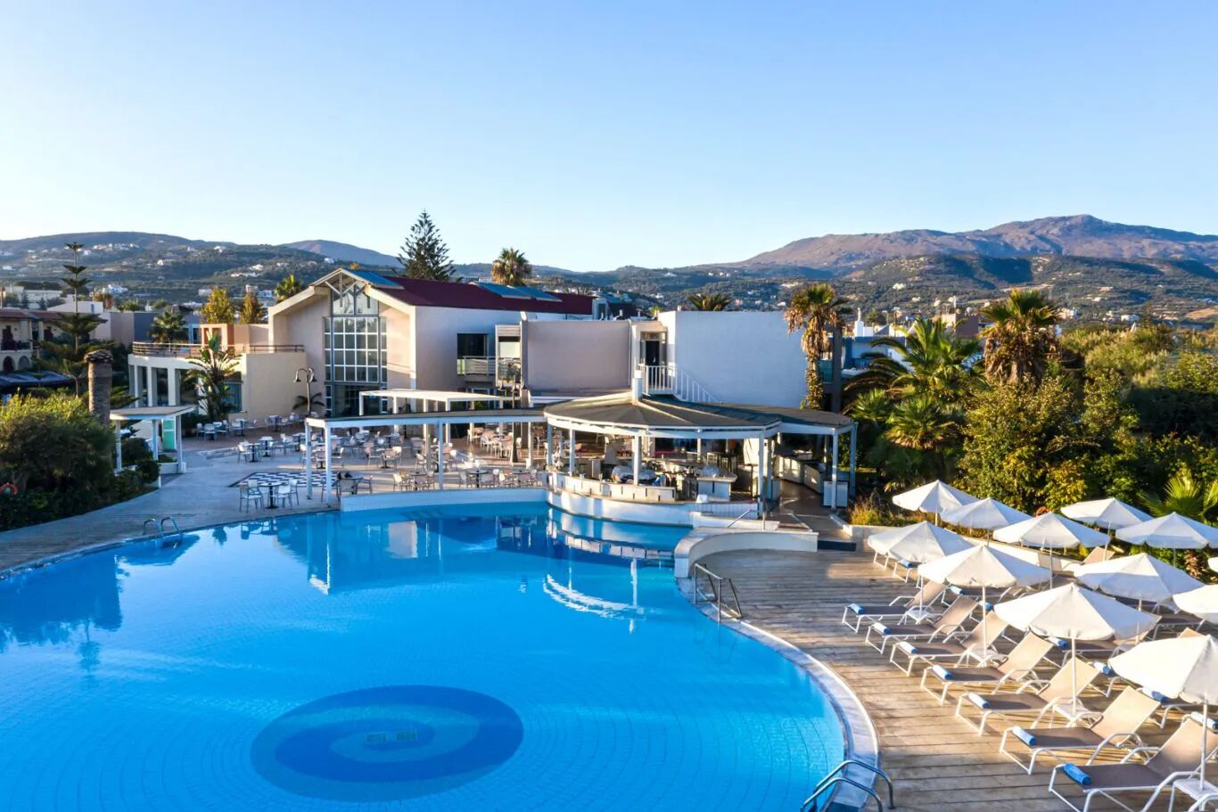Het hotel ligt aan het strand van Platanias en biedt u een spectaculair uitzicht op de smaragdgroene-blauwe zee aan de noordkust van Kreta. Het centrum van Rethymno ligt op ongeveer 4 km afstand, het recreatiegebied op ca. 200 m. Op slechts enkele minuten lopen bereikt u het openbaar vervoer (ca. 100 meter). Naar de luchthaven van Heraklion (ca. 80 km) en Chania (ca. 65 km) is het ca. 2 uur rijden met het openbaar vervoer.